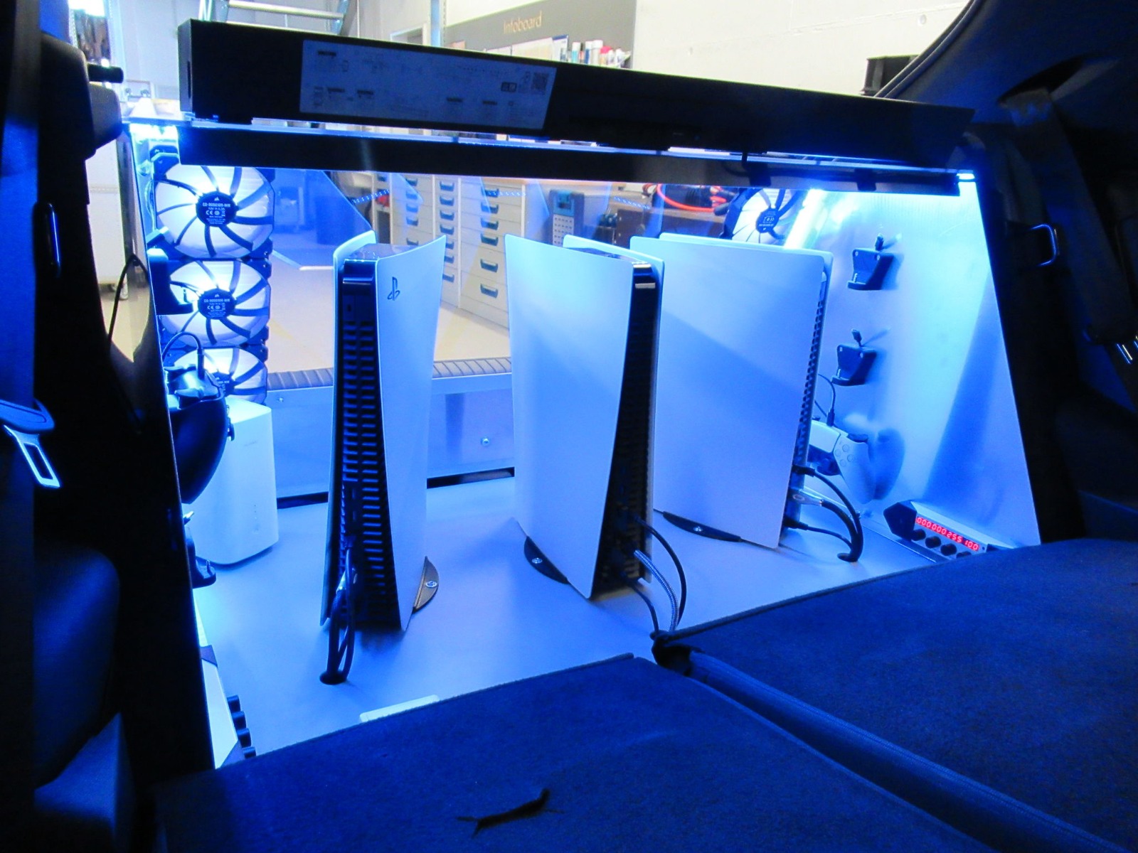 Wir durften den vollelektrischen, bunten Opel Blitz zu einer vollständigen Gamestation veredeln. Die verbauten Highlights betreffen die Fahrzeugelektrik, LED-Aussenbeleuchtung, 230V DEFA-Ausseneinspeisung, drei Playstations inkl. luftgekühlter Box, Controller Halter, 3 Screens sowie ein leistungsfähiges Soundsystem.