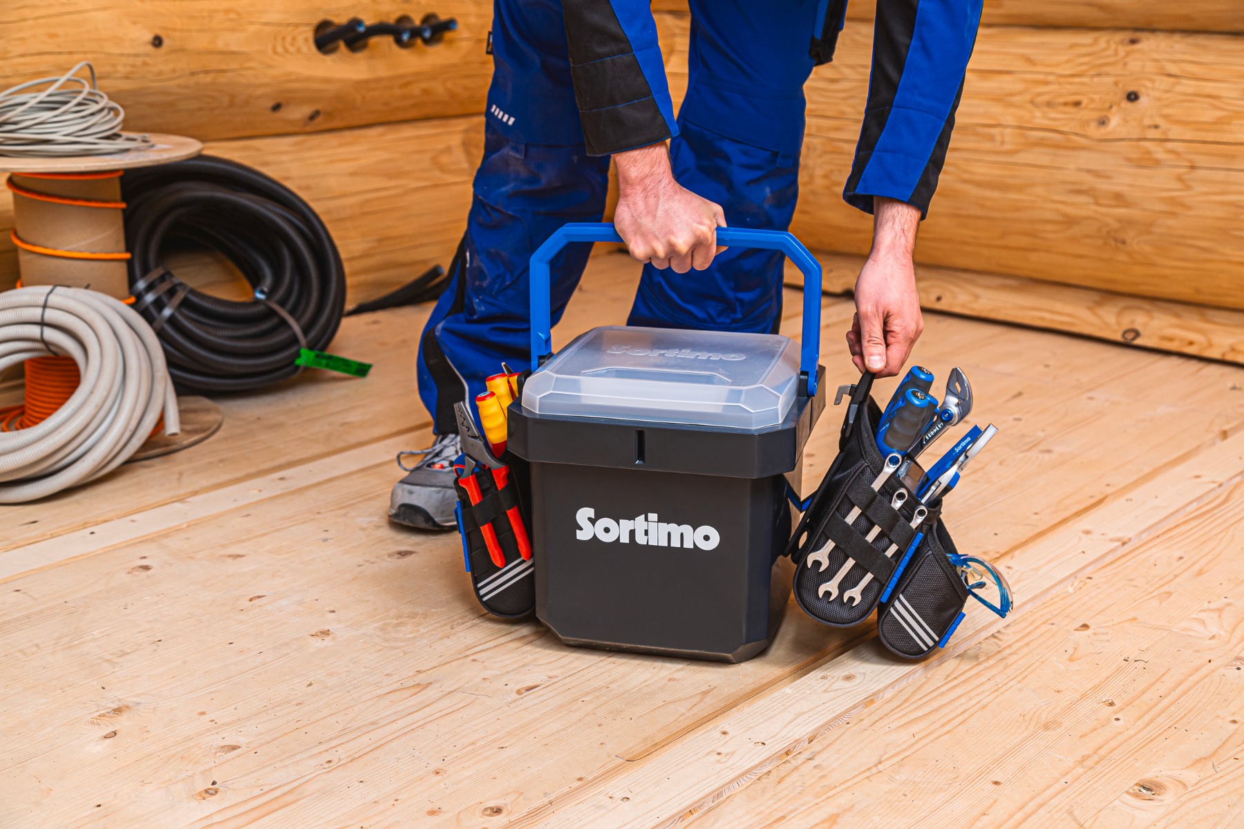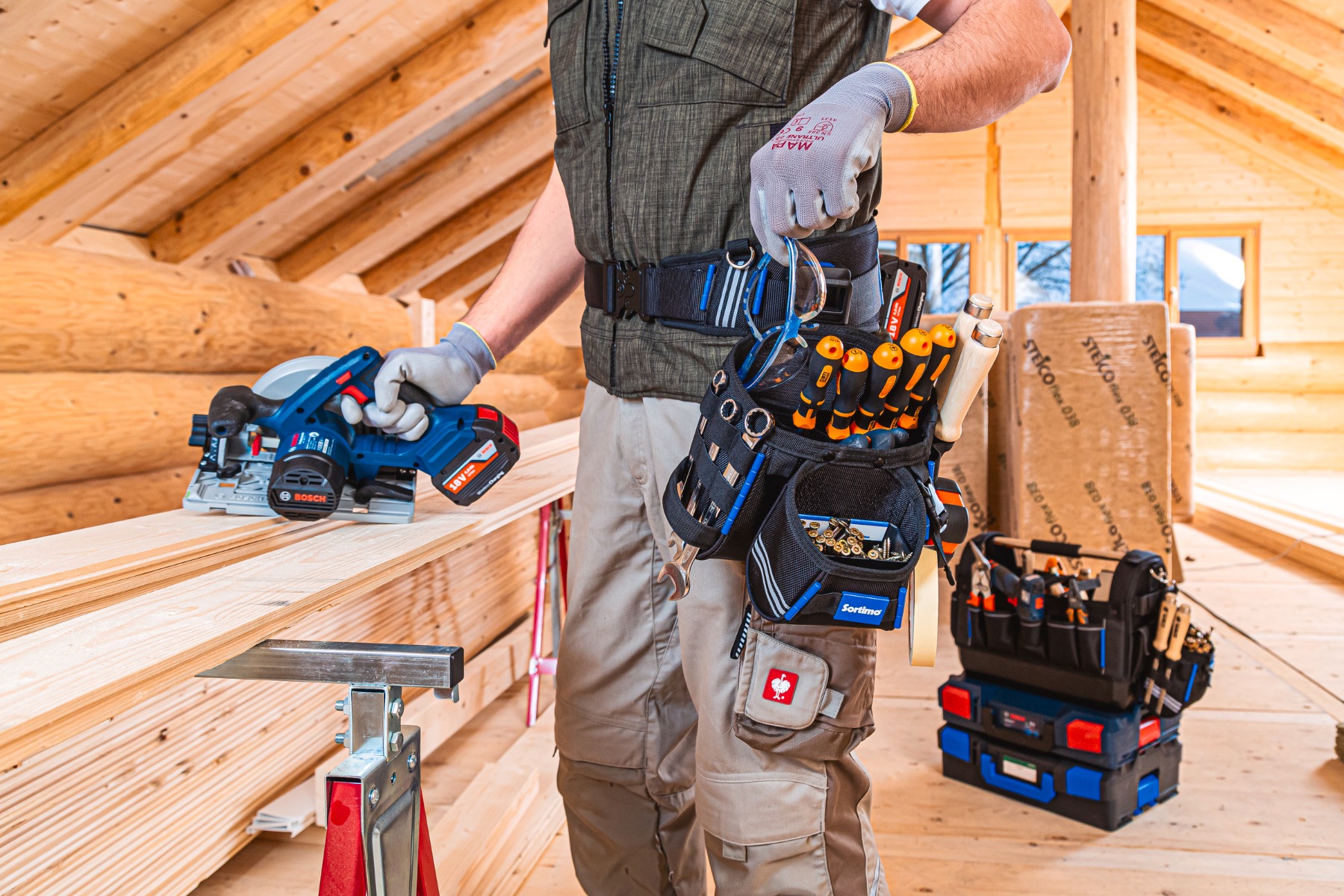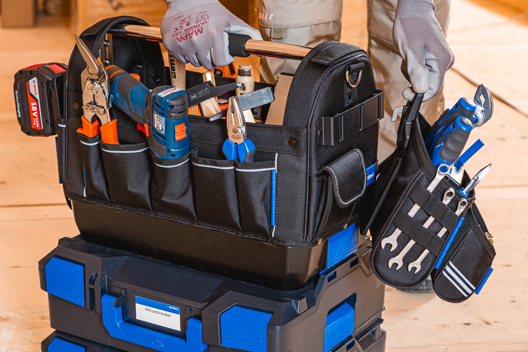 Das ProClick System erlaubt das Tragen von Werkzeugen und Arbeitsmaterialien direkt am Körper über qualitativ hochwertige Textiltaschen und Werkzeuggürtel – die Hände bleiben dabei frei. Dieser Sicherheitsaspekt ist entscheidend in vielen Gewerken, in denen die Arbeitssicherheit das Tragen von Werkzeuggürteln empfiehlt. Als einziges System erlaubt ProClick das Wechseln der Werkzeugtaschen selbst beim Tragen am Körper über nur einen Klick. Darüber hinaus fügt sich ProClick nicht nur als Zubehör in die Sortimo Fahrzeugeinrichtungen ein, sondern lässt sich für den Transport auch mit der L-BOXXen Familie verklicken oder in weitere Sortimo Trägersysteme einhängen.