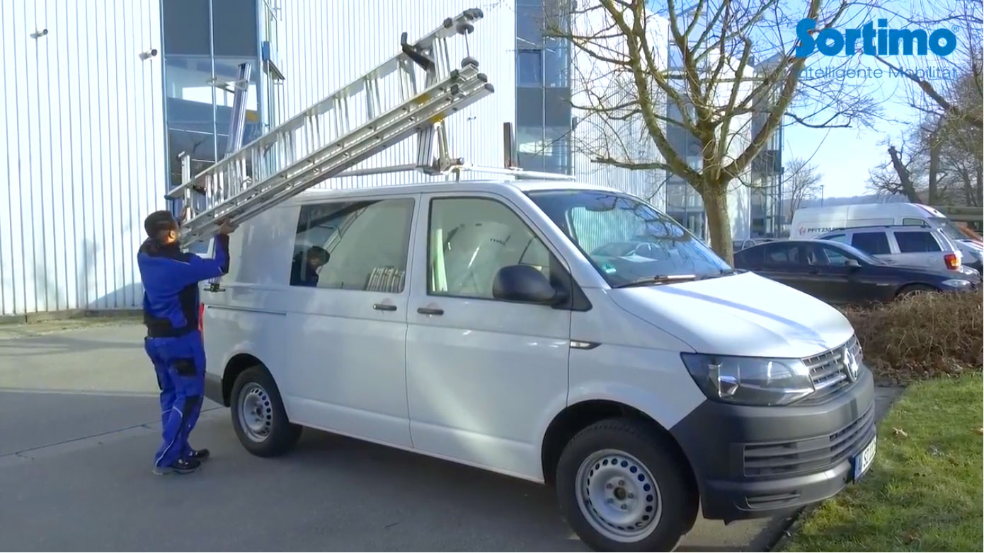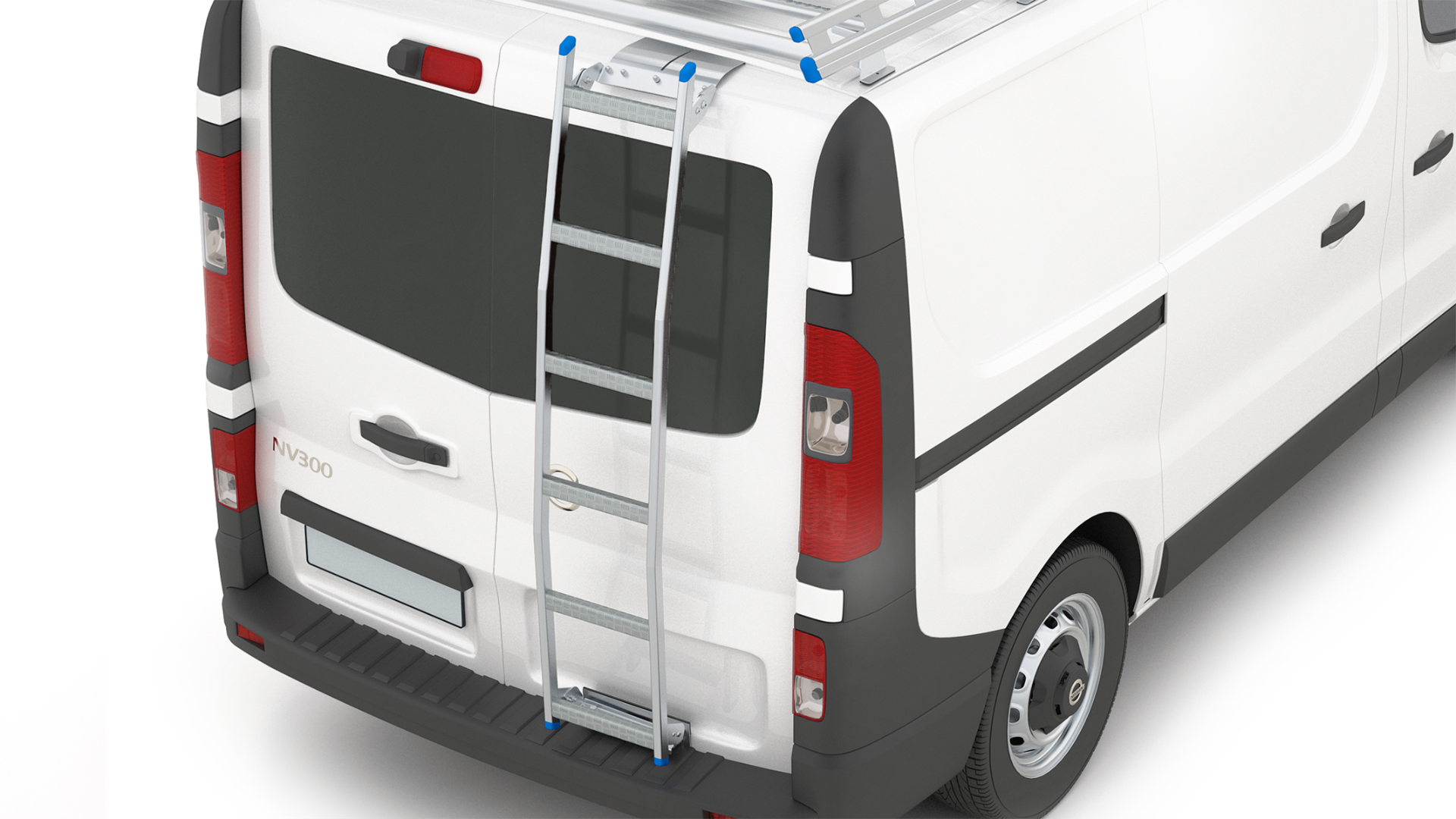 Die Hecktürleitern von Sortimo ermöglichen einen komfortablen Aufstieg zum Be- und Entladen auf dem Dachträger und gewährleisten eine maximale Belastbarkeit von bis zu 100 kg.