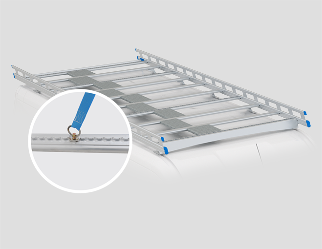 Mit dem geschweissten Aluminium-Lastenträger ProTopRack wird das Sichern und Verzurren auch auf dem Dach leicht gemacht. Die Fittinge der Zurrgurten lassen sich auf dem Lastenträger einklinken und erweitern so den Laderaum. Der Lastenträger ist leicht und dennoch stabil. Mit dem integrierten Laufsteg und der montierten Laderolle ist das ProTopRack der ideale Lastenträger für den professionellen Einsatz.